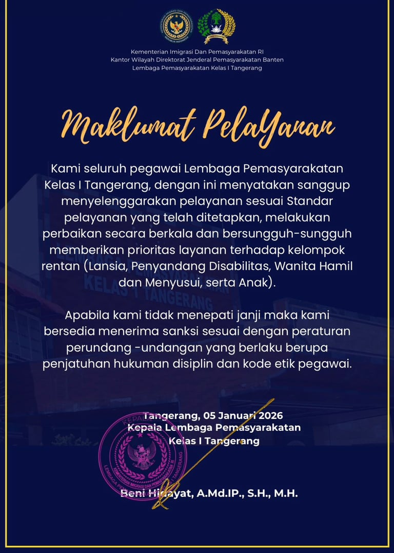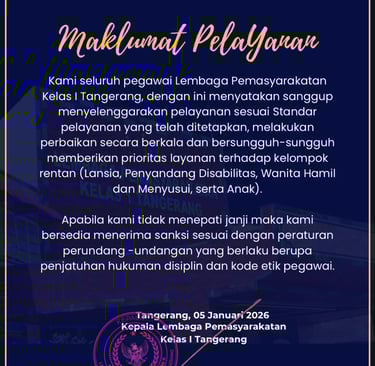 “Selamat datang di website Lapas Kelas I Tangerang, di mana kami berkomitmen untuk menghadirkan pembinaan yang penuh kepedulian dan bermakna, guna membuka jalan bagi setiap warga binaan untuk kembali berkarya dan berperan positif di tengah masyarakat.”